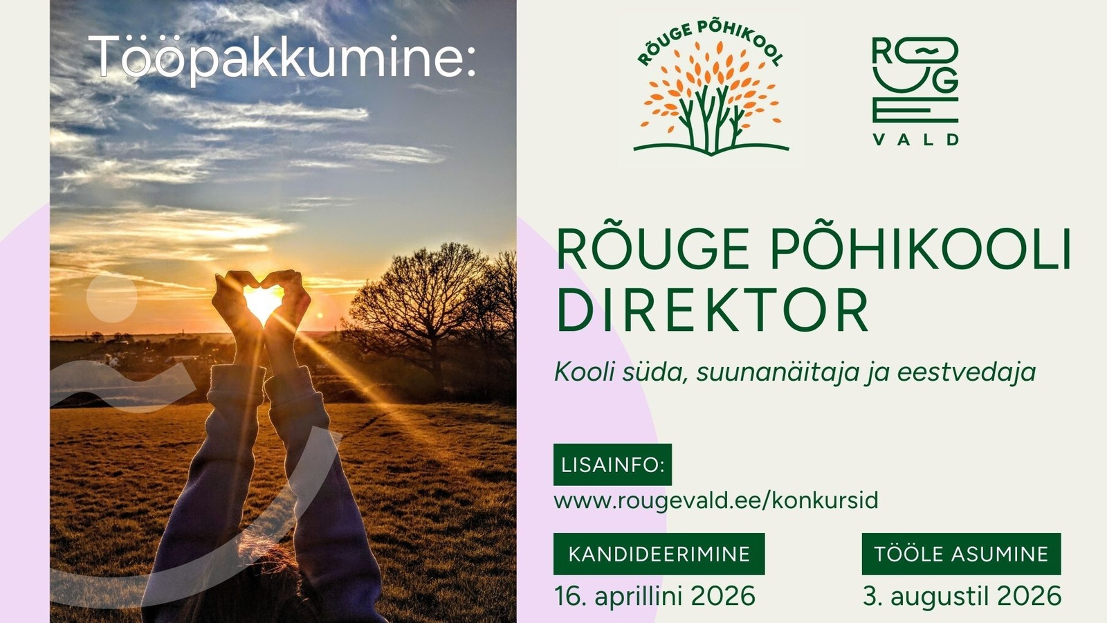 Dokumendid palume esitada digiallkirjastatult 16. aprilliks 2026 e-posti aadressil vald@rougevald.ee või kirjalikult Rõuge Vallavalitsuse aadressil Ööbikuoru 4, Rõuge alevik, Rõuge vald 66201, märgusõnaga „Kooli direktori konkurss“.