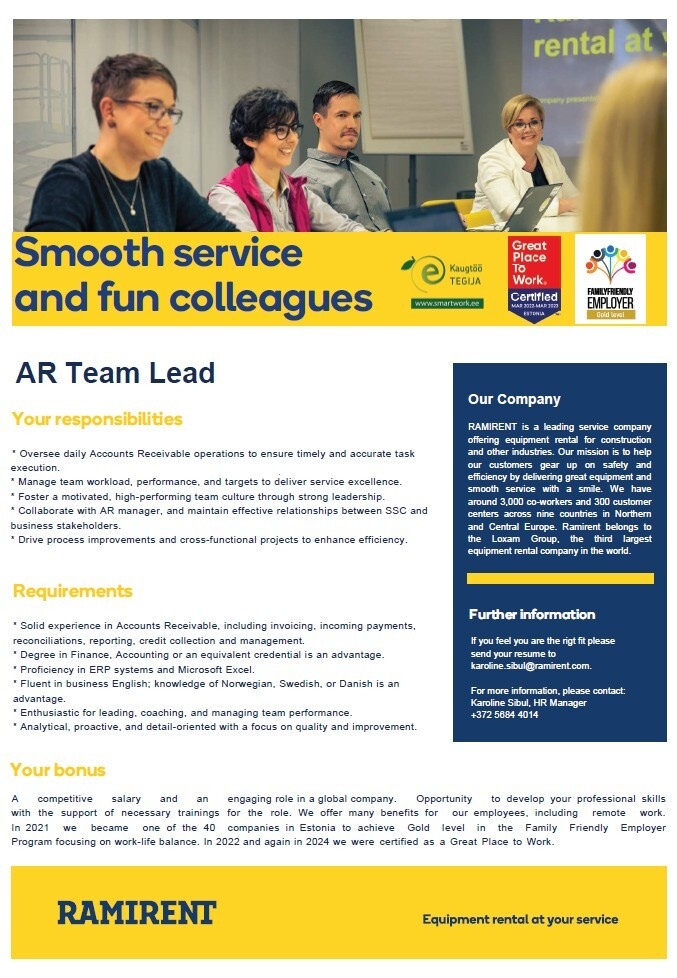 A competitive salary and an engaging role in a global company. Opportunity to develop your professional skills with the support of necessary trainings for the role. Our office is located in the vibrant Ülemiste City and we offer many benefits for our employees, including remote work. In 2021 we became one of the 40 companies in Estonia to achieve Gold level in the Family Friendly Employer Program focusing on work-life balance. In 2022 and again in 2024 we were certified as a Great Place to Work.