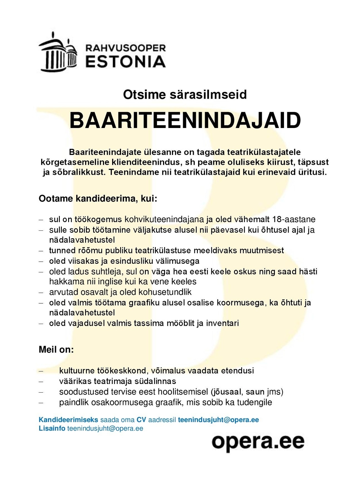 Baariteenindajate ülesanne on tagada teatrikülastajatele kõrgetasemeline klienditeenindus, sh peame oluliseks kiirust, täpsust ja sõbralikkust.
