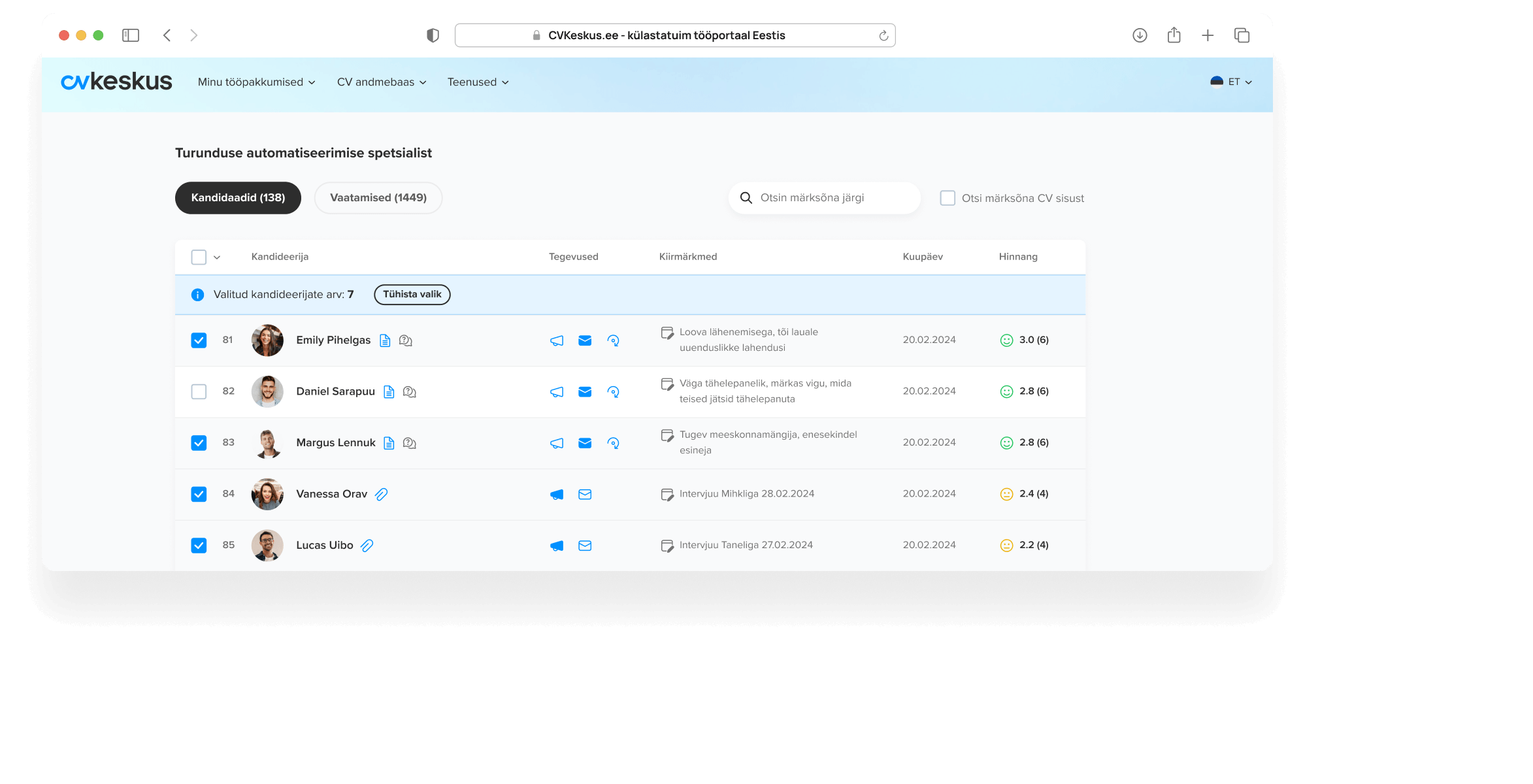 **Tööpakkumise avaldamisel aktiveerub ligipääs kandideerijate haldusplatvormile, mis sisaldab kõike vajalikku värbamisprojekti haldamiseks (hindamine, tagasiside saatmine, kiirmärkmed).