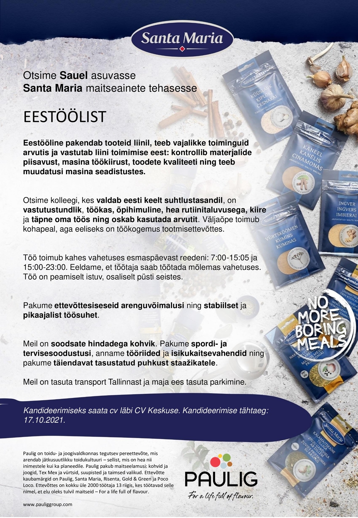 Otsime kolleegi, kes valdab eesti keelt suhtlustasandil, on vastutustundlik, töökas, õpihimuline, hea rutiinitaluvusega, kiire ja täpne oma töös ning oskab kasutada arvutit. Väljaõpe toimub kohapeal, aga eeliseks on töökogemus tootmisettevõttes.