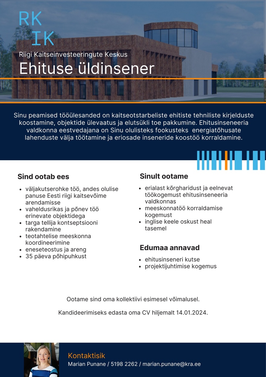 Sinu peamised tööülesanded on kaitseotstarbeliste ehitiste tehniliste kirjelduste koostamine, objektide ülevaatus ja elutsükli toe pakkumine. Ehitusinseneeria valdkonna eestvedajana on Sinu olulisteks fookusteks energiatõhusate lahenduste välja töötamine ja eriosade inseneride koostöö korraldamine.