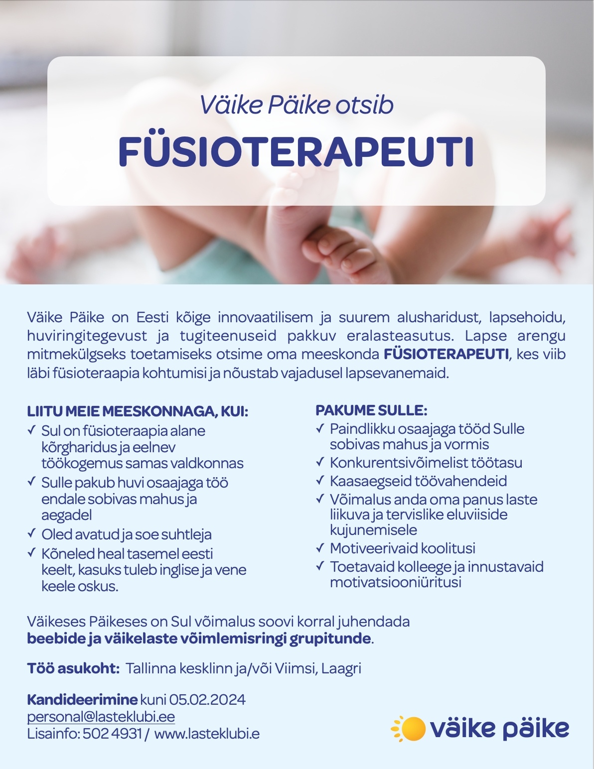 Väike Päike on Eesti kõige innovaatilisem ja suurem alusharidust, lapsehoidu, huviringitegevust ja tugiteenuseid pakkuv eralasteasutus. Lapse arengu mitmekülgseks toetamiseks otsime oma meeskonda FÜSIOTERAPEUTI, kes viib läbi füsioteraapia kohtumisi ja nõustab vajadusel lapsevanemaid. Soovi korral on võimalus juhendada beebide ja väikelaste võimlemisringi grupitunde.