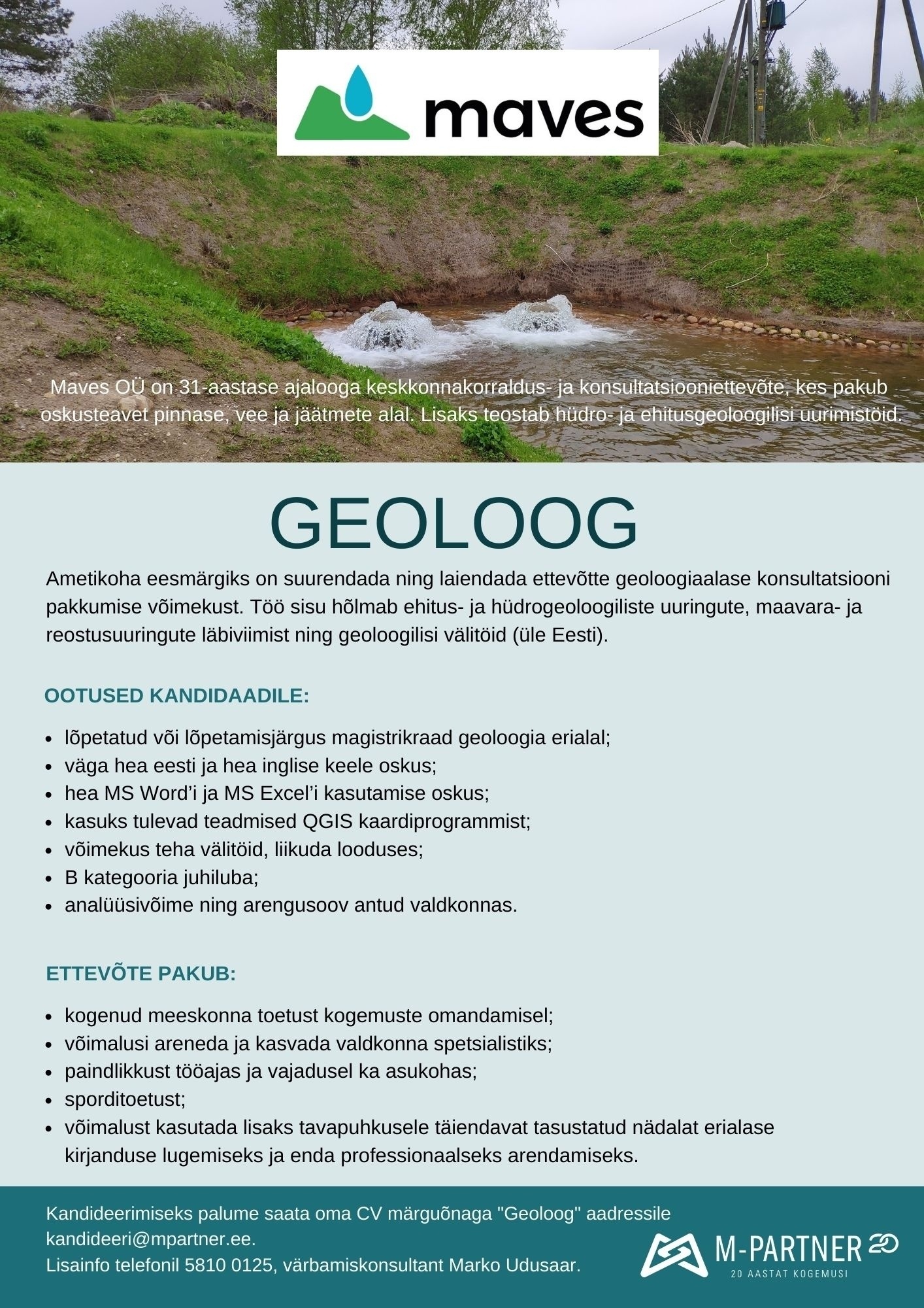 Ametikoha eesmärgiks on suurendada ning laiendada ettevõtte geoloogiaalase konsultatsiooni pakkumise võimekust. Töö sisu hõlmab ehitus- ja hüdrogeoloogiliste uuringute, maavara- ja reostusuuringute läbiviimist ning geoloogilisi välitöid (üle Eesti).