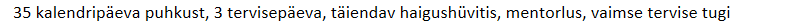 35 kalendripäeva puhkust, 3 tervisepäeva, täiendav haigushüvitis, mentorlus, vaimse tervise tugi.
