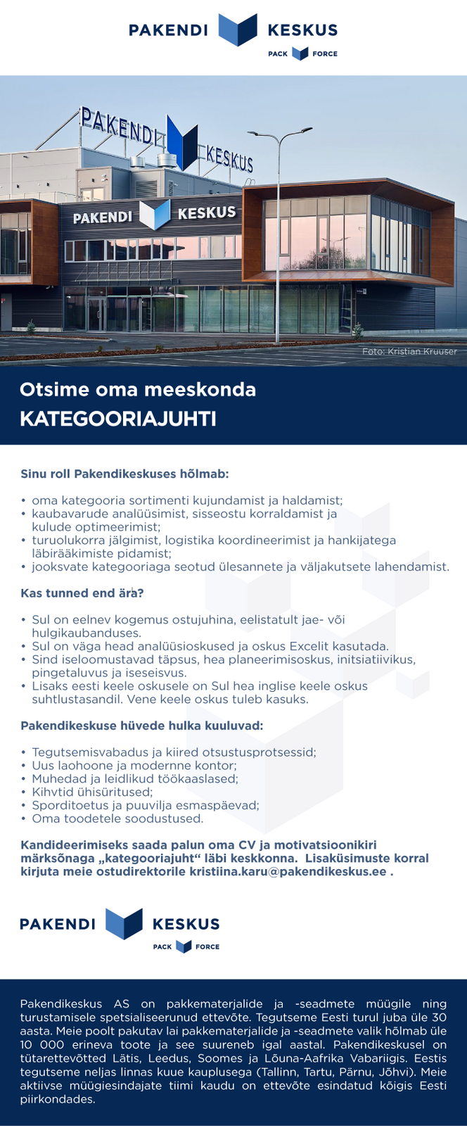 Kandideerimiseks saada palun oma CV ja motivatsioonikiri märksõnaga „kategooriajuht“ läbi keskkonna. Lisaküsimuste korral kirjuta meie ostudirektorile kristiina.karu@pakendikeskus.ee .