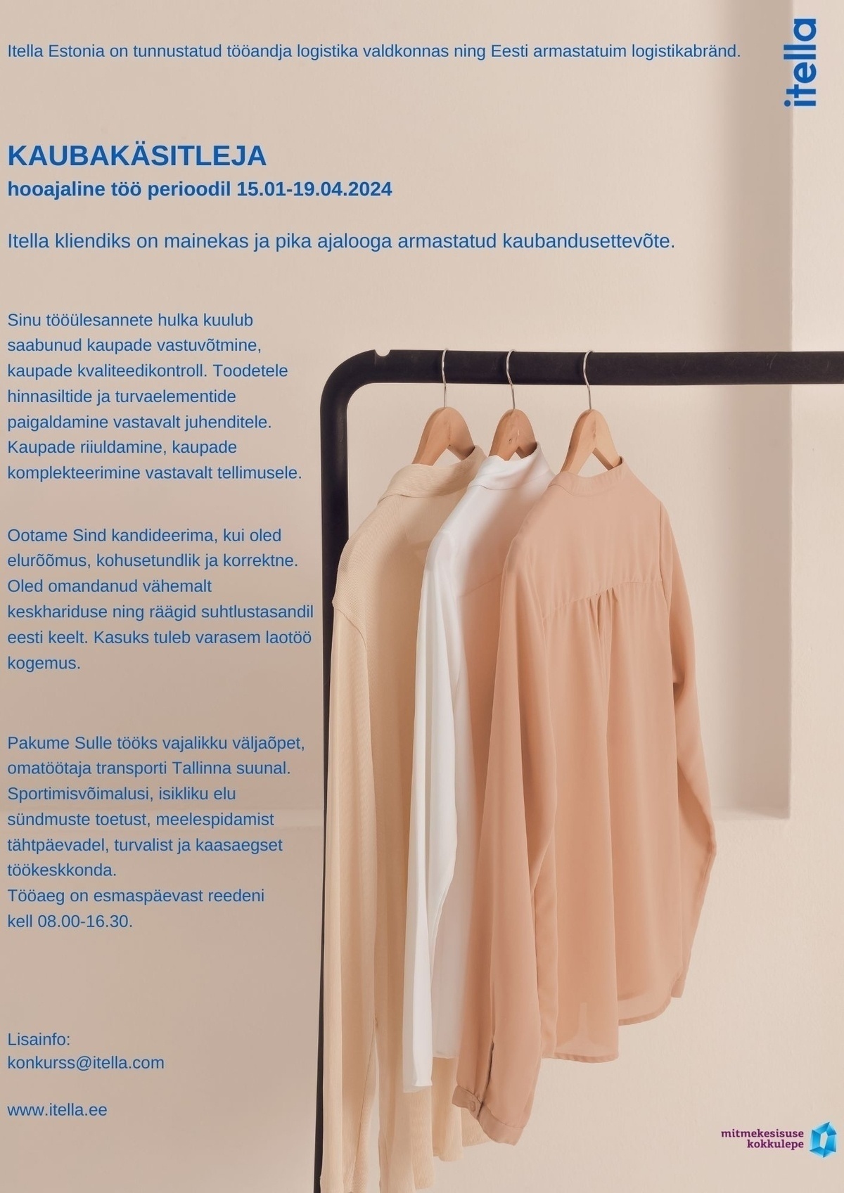 Ootame Sind kandideerima, kui oled elurõõmus, kohusetundlik ja korrektne. Oled omandanud vähemalt keskhariduse ning räägid suhtlustasandil eesti keelt. Kasuks tuleb varasem laotöö kogemus.