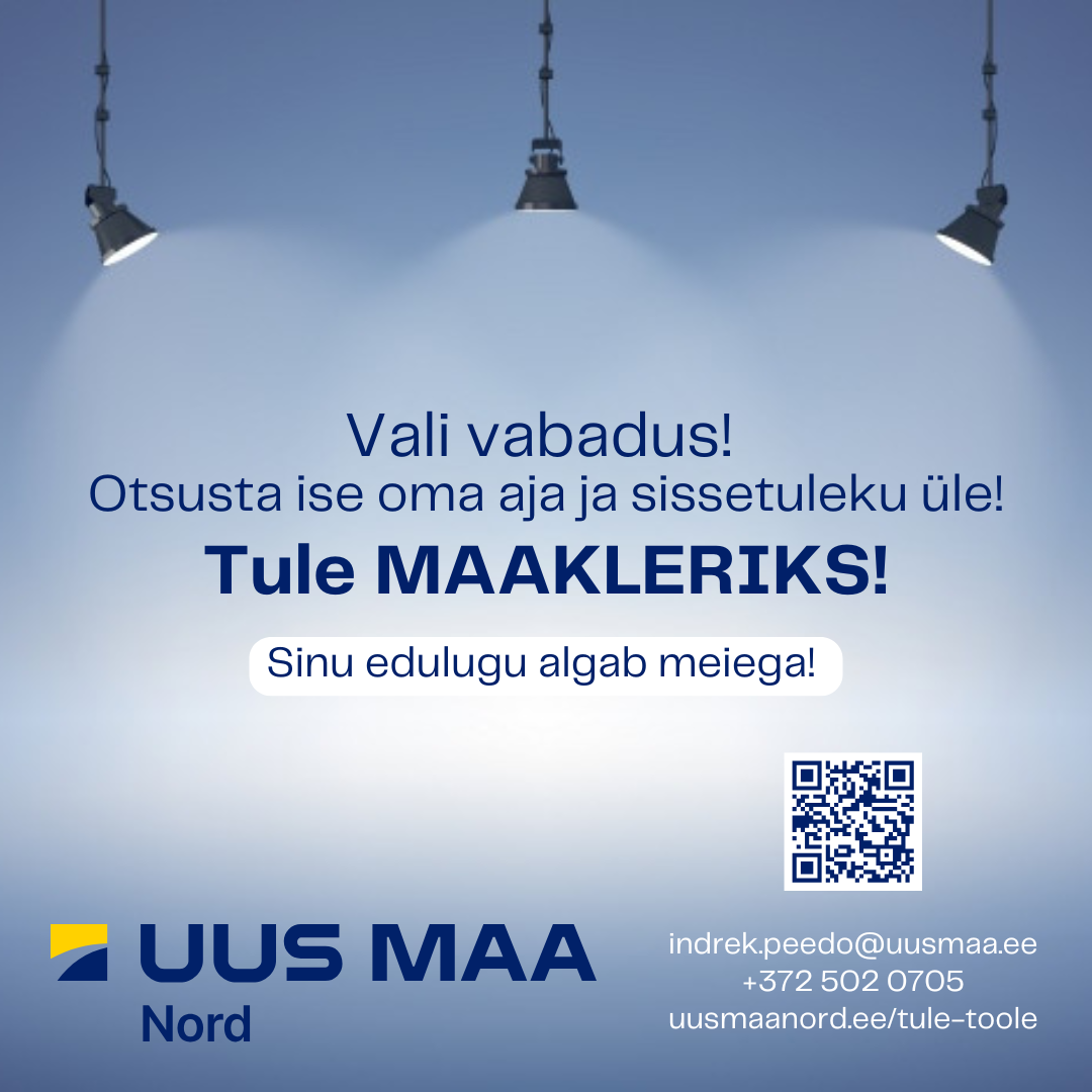 Vali vabadus! Otsusta ise oma aja ja sissetuleku üle! Tule maakleriks UUS MAA Nordi, kus sind ootab toetav tiim, arenguvõimalused ja piiramatud teenimisvõimalused. Sinu edulugu algab meiega. Kandideeri juba täna ja tee oma elus järgmine samm!