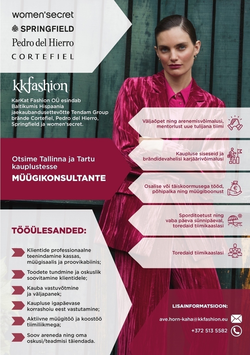 Kui tunned rõõmu inimestega suhtlemisest, oled särasilmne, töökas ja kohusetundlik, sulle meeldib tegeleda moekaubaga siis ootame Sind kandideerima meie Tallinna ja Tartu kauplustesse Cortefiel, women`secret ja Springfield klienditeenindaja ametikohale!