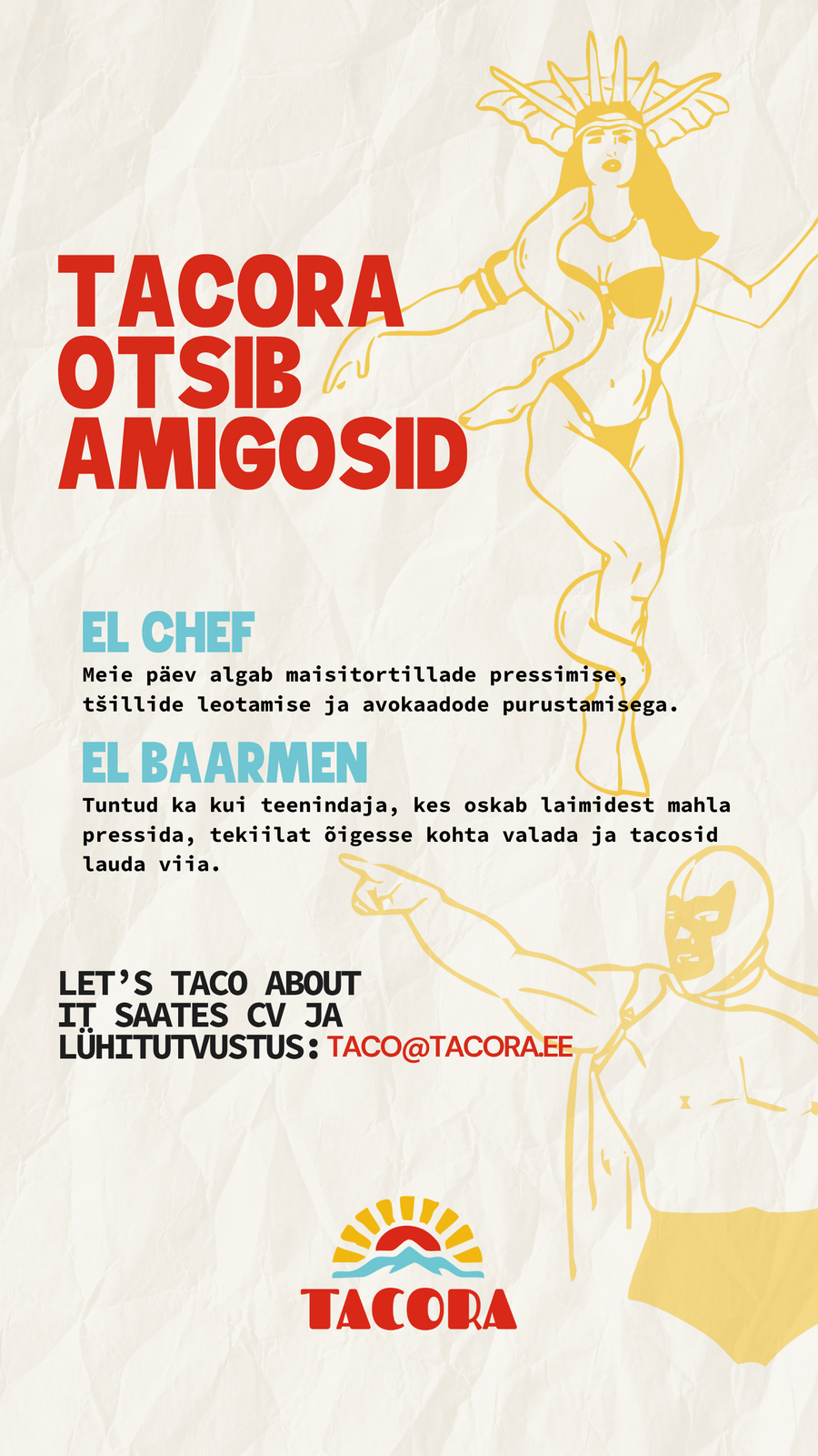 Tartu uusim toidukoht otsib kokkasid. Tacora on klassikaline tacobaar, mis keskendub autentsele Mehhiko tacole ja tekiilajookidele. Tacod valmistame ise algusest lõpuni. Menüü on lühike ja konkreetne: viis tacot, salsad, nachod & churrod.