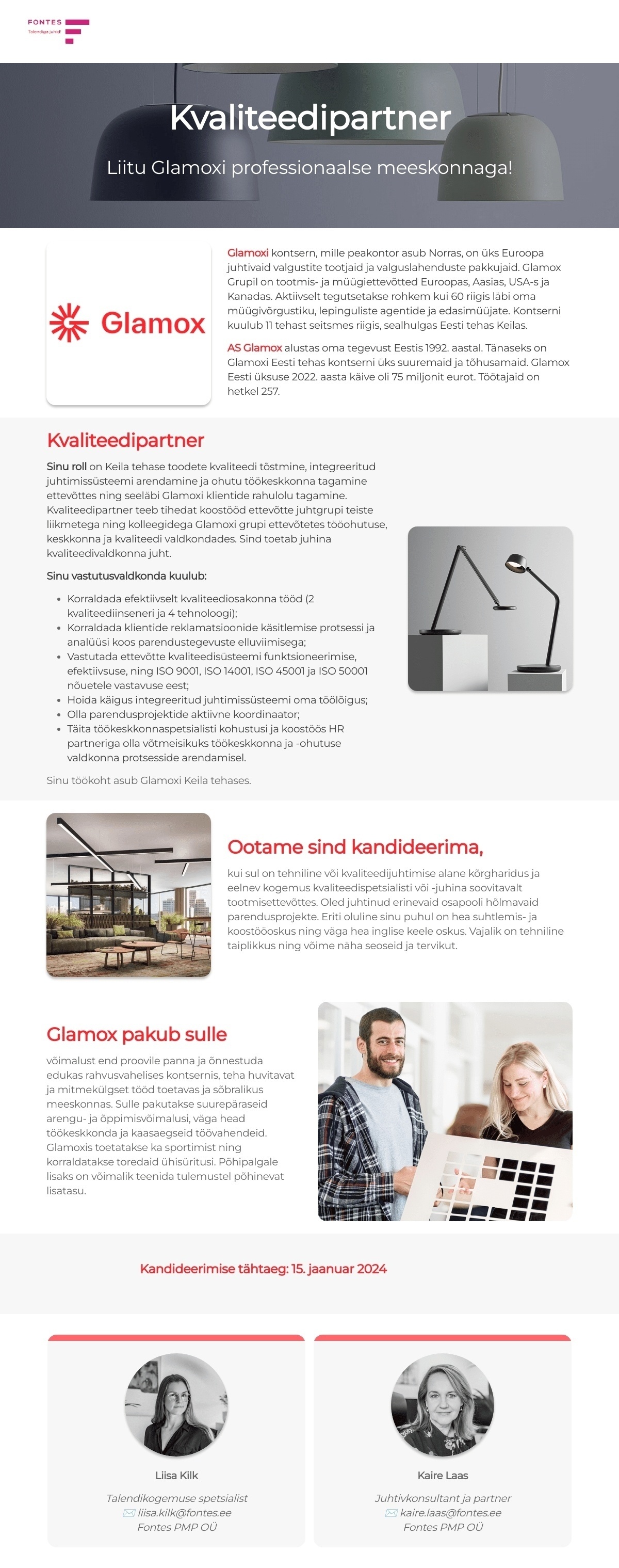 Glamox pakub sulle võimalust end proovile panna ja õnnestuda edukas rahvusvahelises kontsernis, teha huvitavat ja mitmekülgset tööd toetavas ja sõbralikus meeskonnas. Sulle pakutakse suurepäraseid arengu- ja õppimisvõimalusi, väga head töökeskkonda ja kaasaegseid töövahendeid. Glamoxis toetatakse ka sportimist ning korraldatakse toredaid ühisüritusi. Põhipalgale lisaks on võimalik teenida tulemustel põhinevat lisatasu.