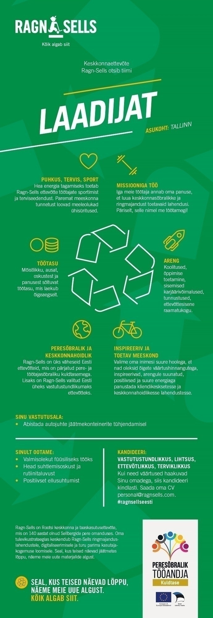 Meie keskkonnasõbralikus ja töökas meeskonnas saab tööd LAADIJA, kelle tööks on olla autojuhile abiks prügikonteinerite tühjendamisel.