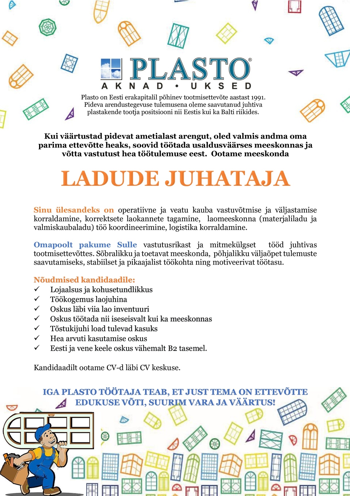 Sinu ülesandeks on operatiivne ja veatu kauba vastuvõtmise ja väljastamise korraldamine, korrektsete laokannete tagamine, laomeeskonna (materjaliladu ja valmiskaubaladu) töö koordineerimine, logistika korraldamine, inventuurides osalemine.