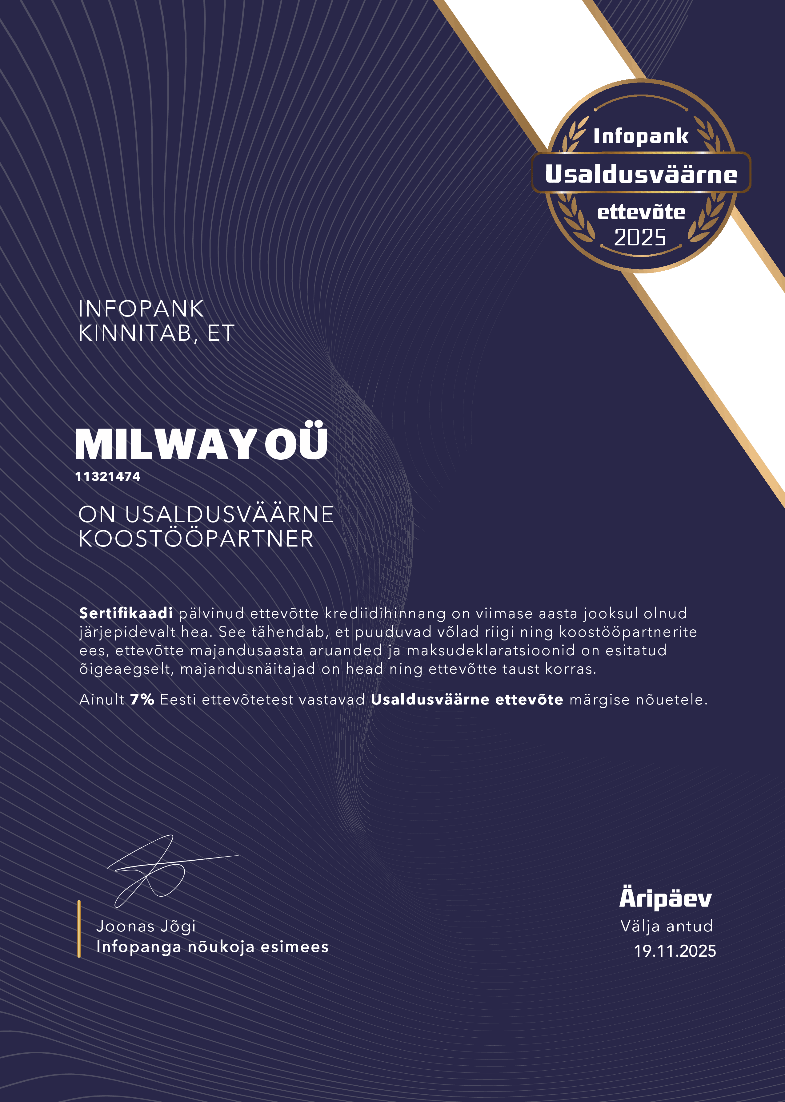 Milway OÜ on 2006. aastal loodud Eesti kapitalil põhinev ettevõte, mis on tänaseks kasvanud usaldusväärseks ja kogenud partneriks logistika- ja transpordivaldkonnas. Viimased enam kui kuus aastat oleme keskendunud erivedudele, pakkudes oma klientidele spetsialiseeritud ja terviklahendusi nii Eestis kui ka rahvusvahelisel tasandil.