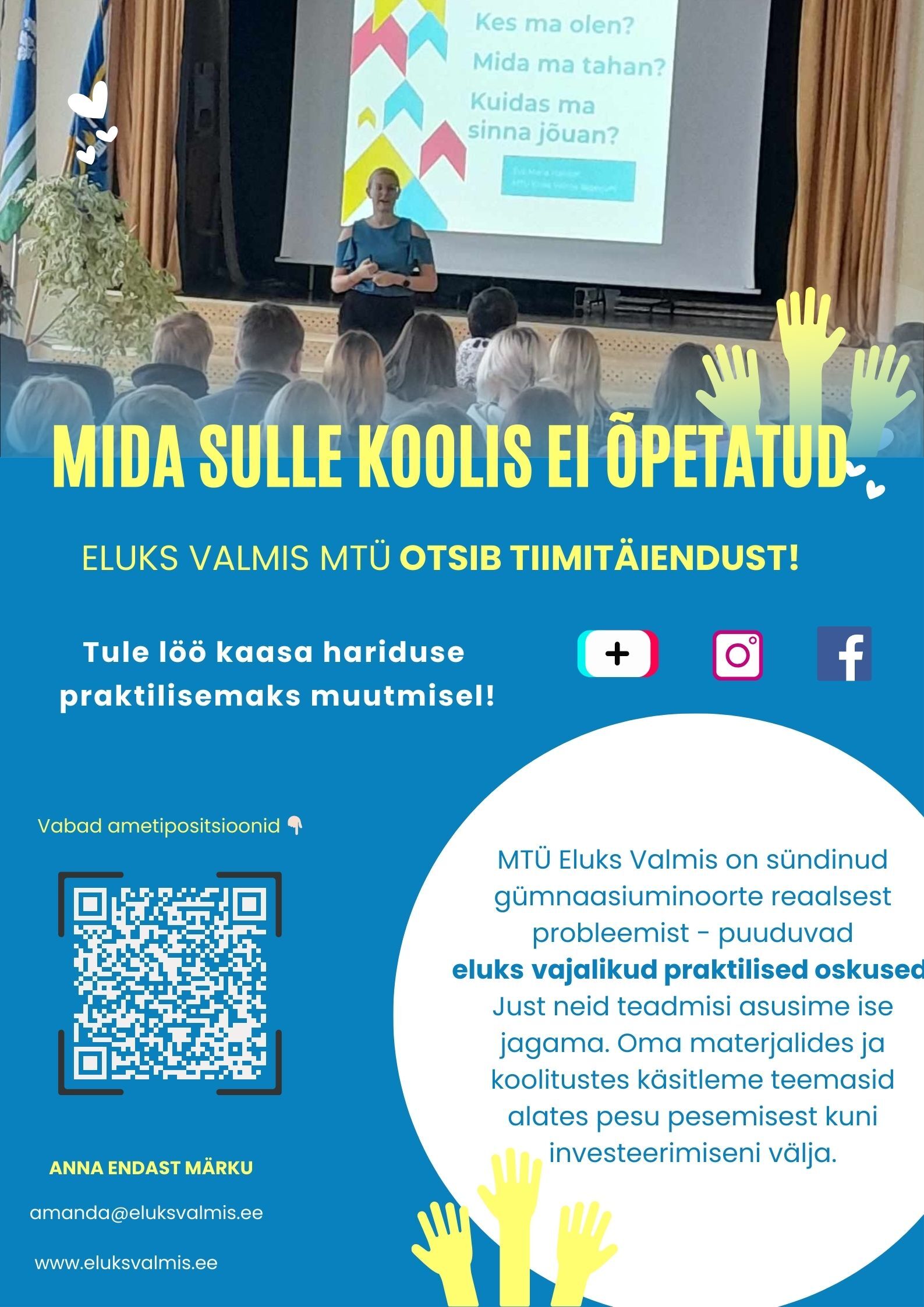 Eluks Valmis on noortelt noortele algatus, mille eesmärk on õpetada noortele neid teadmisi, mida koolis ei õpetata, kuid mis on iseseisvas elus hästi toimetamiseks vajalikud. Meie materjalidega harime noori teemadel alates pesu pesemisest kuni investeerimiseni välja (ja kõik, mis sinna vahele jääb).