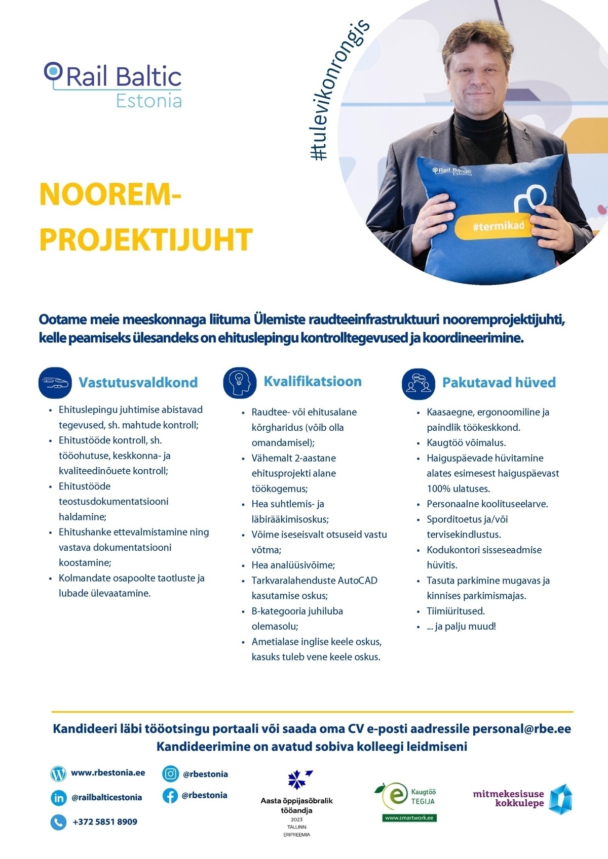 Ootame meie meeskonnaga liituma Ülemiste raudteeinfrastruktuuri nooremprojektijuhti, kelle peamiseks ülesandeks on ehituslepingu kontrolltegevused ja koordineerimine sh.