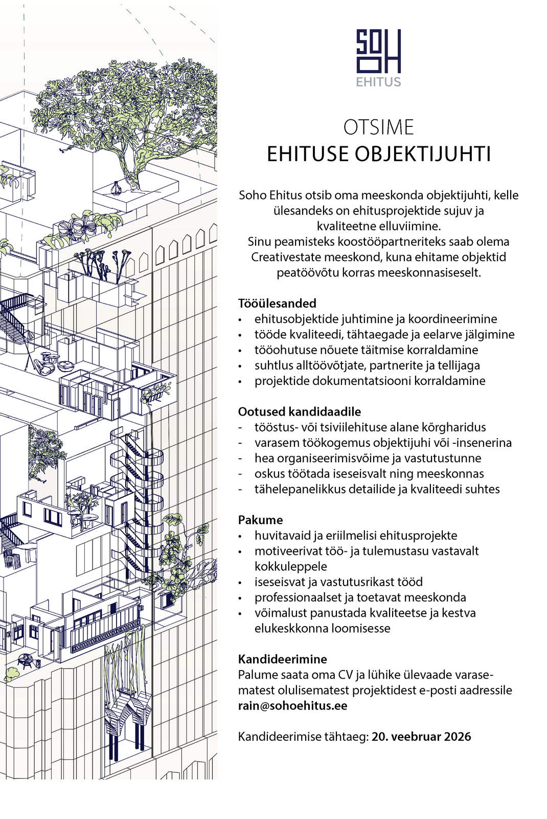 Soho Ehitus otsib oma meeskonda ehituse objektijuhti, kelle ülesandeks on ehitusprojektide sujuv ja kvaliteetne elluviimine. Pakume võimalust töötada huvitavate projektidega ning areneda professionaalses ja toetavas meeskonnas.