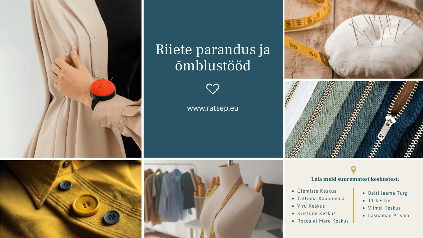 Meie lemmiktööd on pükste lühendamine, tõmblukkude vahetamine ja -parandamine. Samuti teeme riideid kitsamaks, laiemaks, pikemaks, paikame ja lapime, õmbleme nööpe, paigaldame trukke nin ööse ning õmbleme lahti tulnud õmblused, kohendame kardinaid ja muud kodutekstiili, parandame nahast riideid ja esemeid ning teeme köösneritööd.
