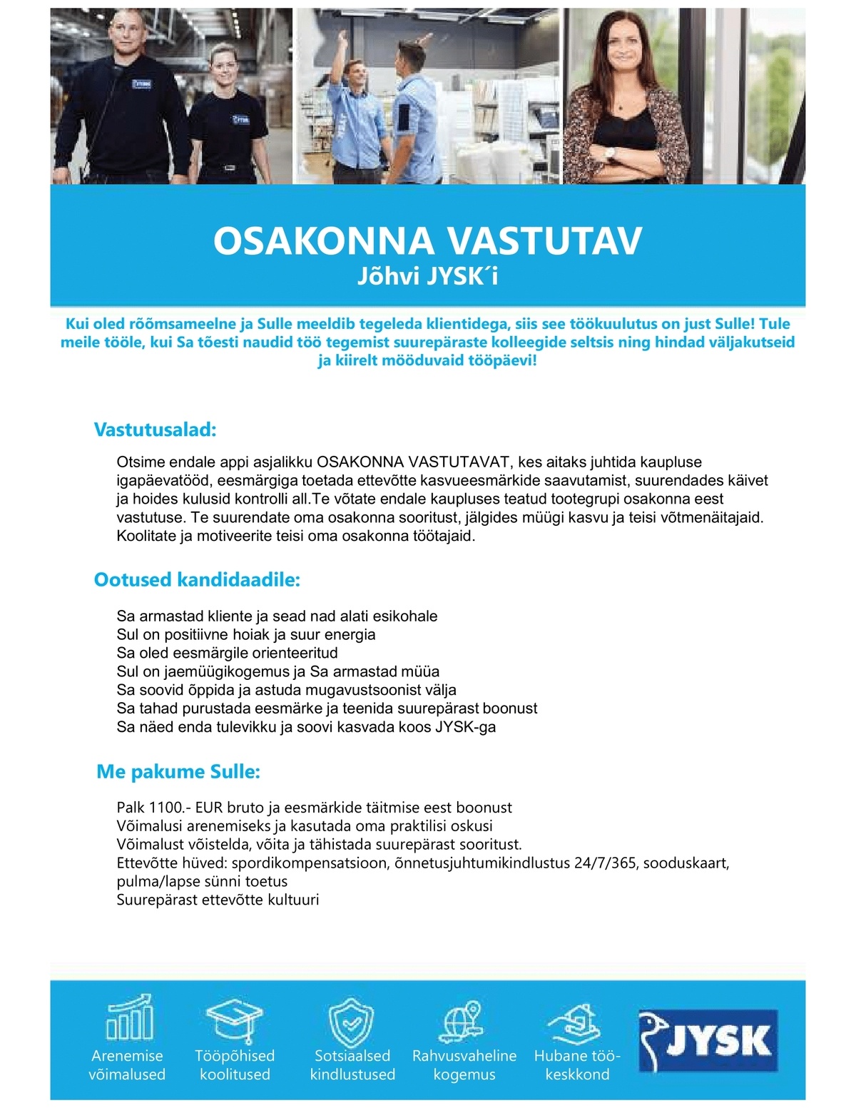 Hei! Otsime endale appi asjalikku OSAKONNA VASTUTAVAT, kes aitaks juhtida kaupluse igapäevatööd, eesmärgiga toetada ettevõtte kasvueesmärkide saavutamist, suurendades käivet ja hoides kulusid kontrolli all.