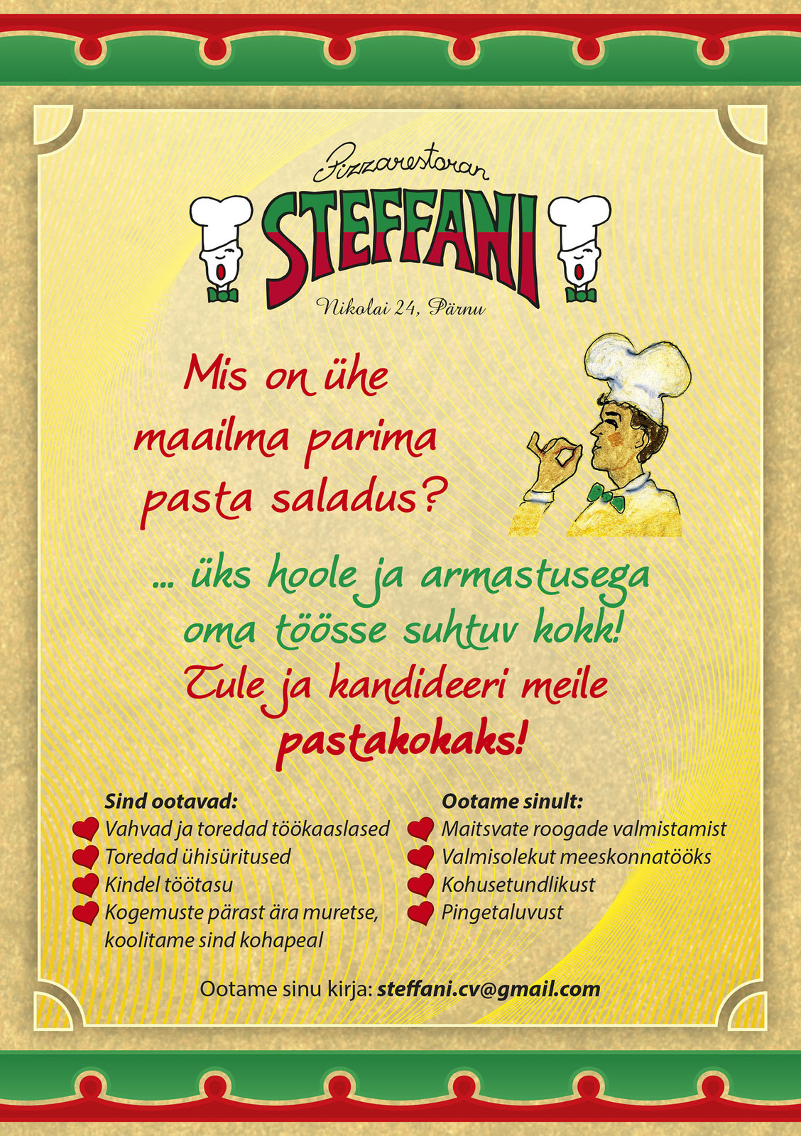Meie usaldame Sulle:• meie maja maitsva toidu valmistamise • tooraine ettevalmistuse • meeskonna abistamise • oma töökoha korrashoiu eest hoolitsemise
