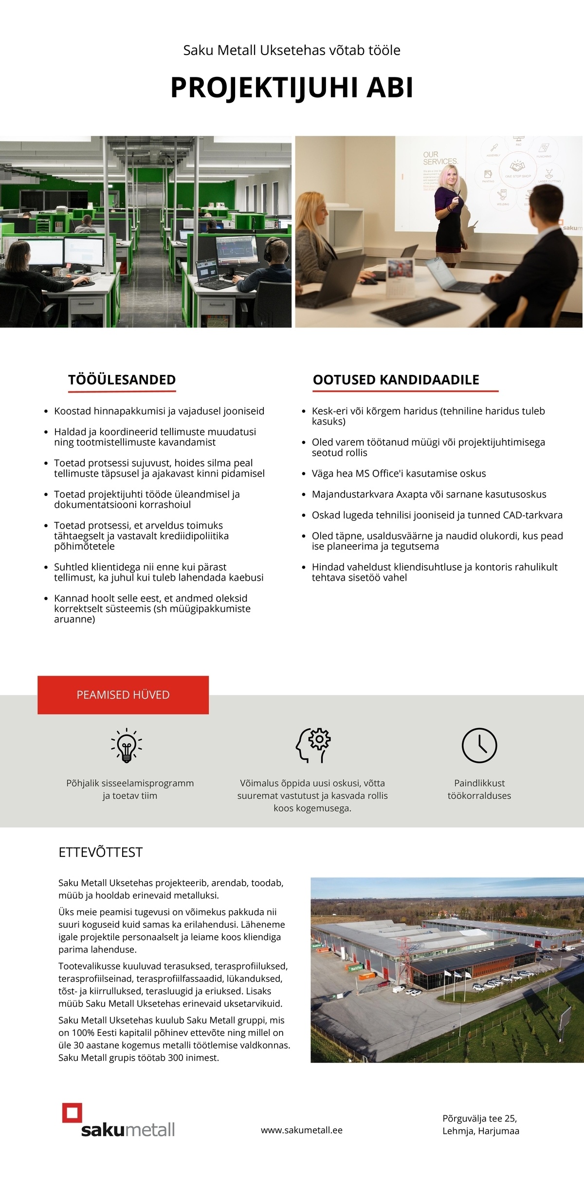 Sinu töö on mitmekesine: ühel päeval suhtled kliendiga, teisel keskendud tellimuste sisestamisele ja koostad pakkumisi. Kui tunned, et projektijuhi amet on Sinu järgmine samm, aitame Sul sinna jõuda.