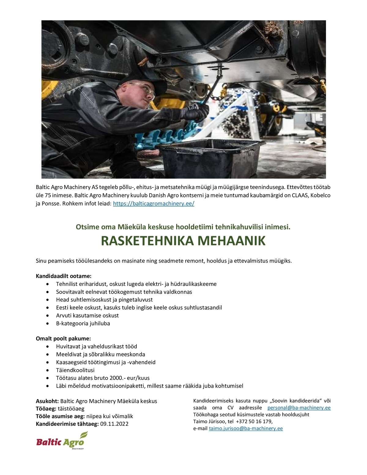 Kandideerimiseks kasuta nuppu „Soovin kandideerida“ või saada oma CV aadressile personal(at)ba-machinery.ee Töökohaga seotud küsimustele vastab hooldusjuht