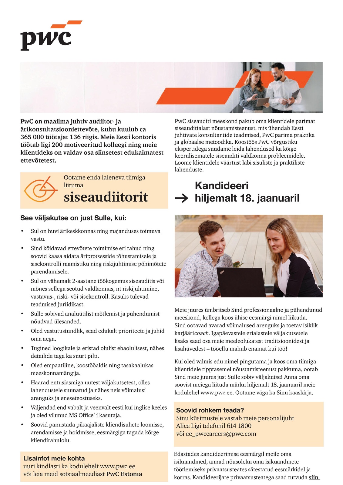 Kui oled valmis edu nimel pingutama ja koos oma tiimiga klientidele tipptasemel nõustamisteenust pakkuma, ootab Sind meie juures just Sulle sobiv väljakutse! Anna oma soovist meiega liituda märku hiljemalt 18. jaanuaril meie kodulehel www.pwc.ee. Ootame väga ka Sinu kaaskirja.
