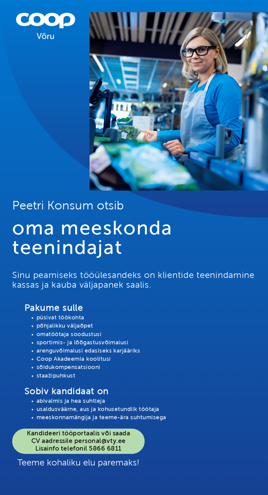 Otsime Peetri Konsumisse töökat TEENINDAJAT, kelle peamisteks tööülesanneteks on klientide teenindamine nii tava kui ka nutikassas, kaupade korrektne väljapanek ja saali korrashoid.