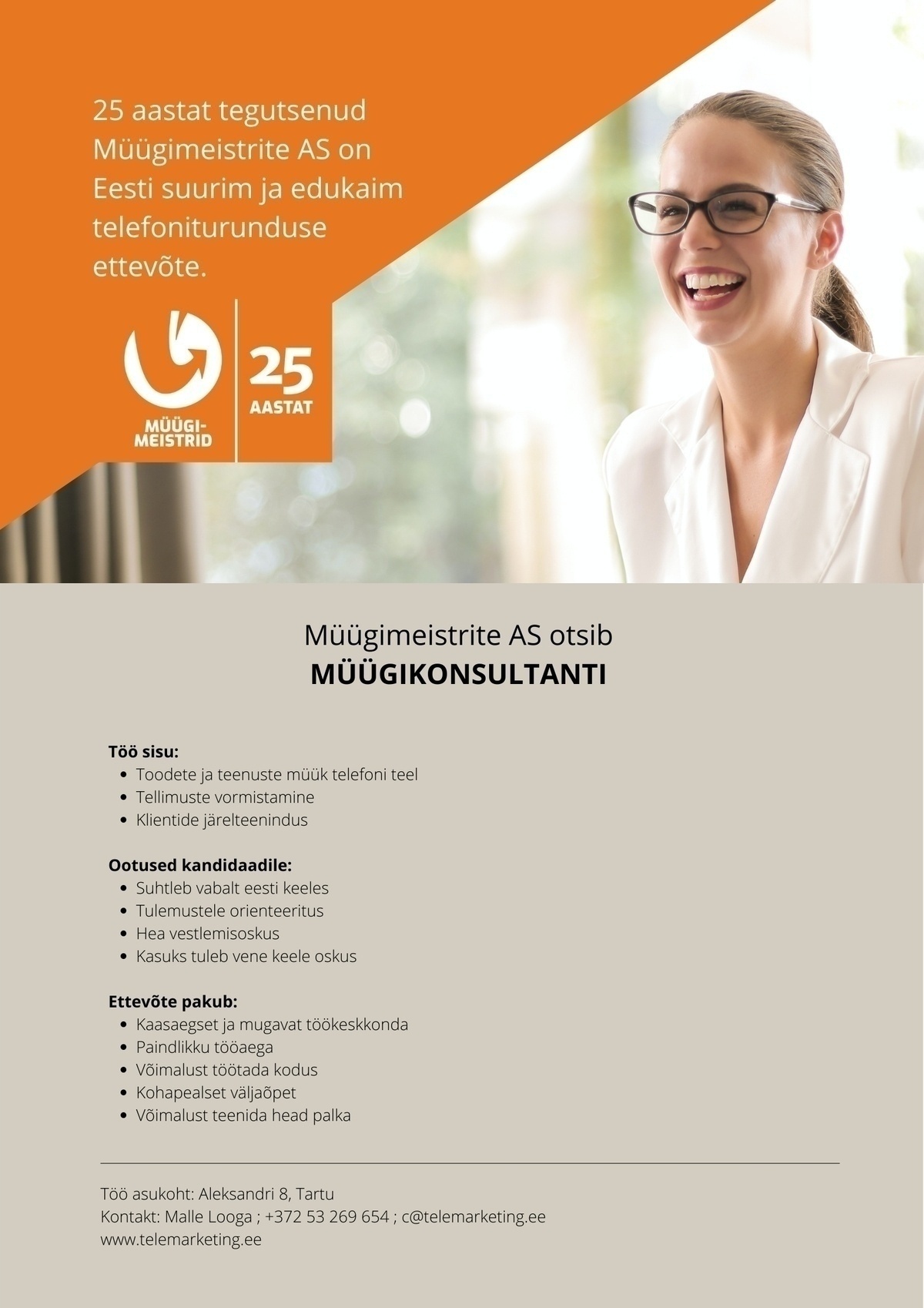 Tööd saab telefonimüüja; töö sobib kõigile, kasuks tuleb kogemus valdkondades: telemarketing, müügikonsultant, kliendihaldur, klienditeenindaja, konsultant, müüja, müügiassistent, jne.