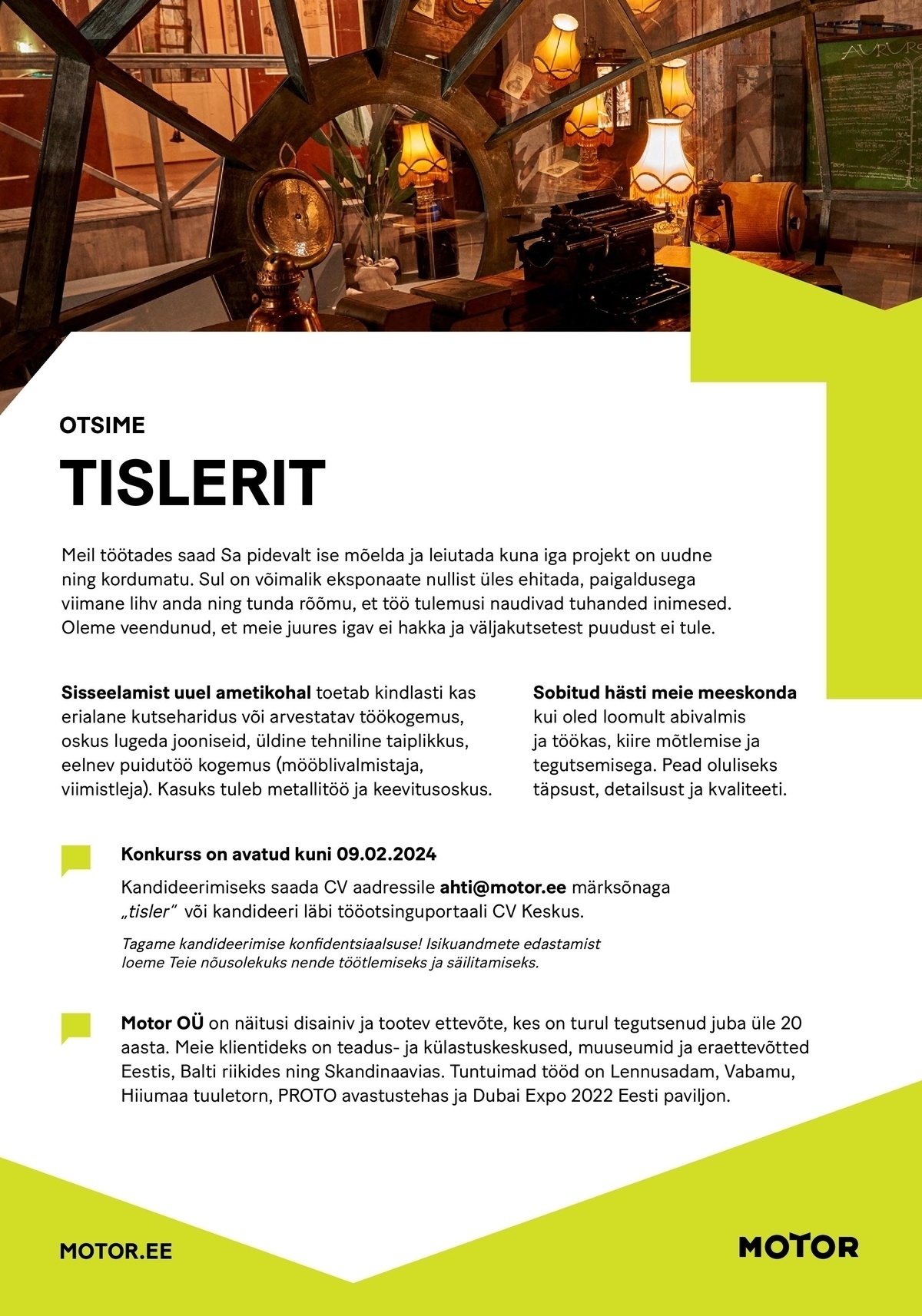 Motor OÜ otsib tislerit. Meil töötades saad Sa pidevalt ise mõelda ja leiutada kuna iga projekt on uudne ning kordumatu. Sul on võimalik eksponaate nullist üles ehitada, paigaldusega viimane lihv anda ning tunda rõõmu, et töö tulemusi naudivad tuhanded inimesed.Oleme veendunud, et meie juures igav ei hakka ja väljakutsetest puudust ei tule.