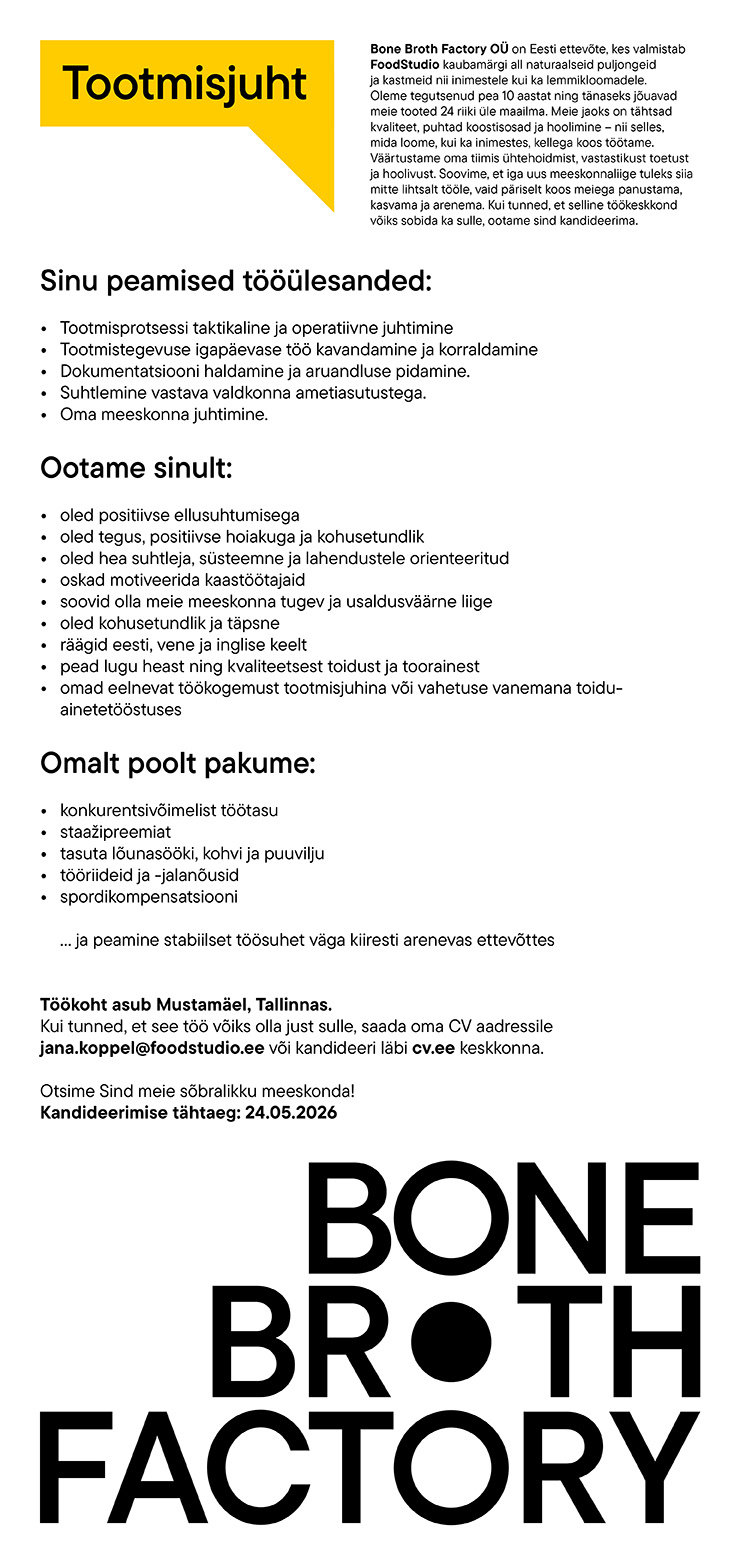 Bone Broth Factory OÜ on Eesti ettevõte, kes valmistab FoodStudio kaubamärgi all naturaalseid puljongeid ja kastmeid nii inimestele kui ka lemmikloomadele. Oleme tegutsenud pea 10 aastat ning tänaseks jõuavad meie tooted 24 riiki üle maailma.