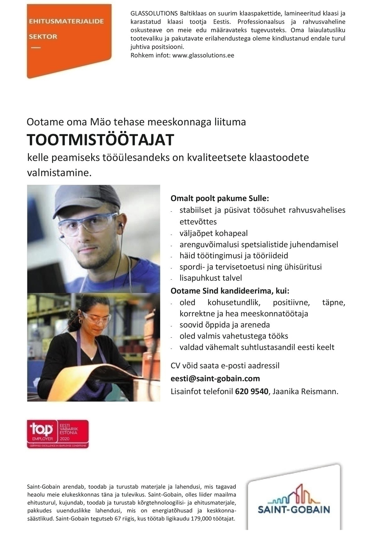 Ootame oma Mäo tehase meeskonnaga liituma TOOTMISTÖÖTAJAT, kelle peamiseks tööülesandeks on kvaliteetsete klaastoodete valmistamine