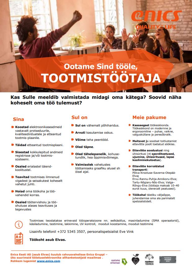 Meie pakume kaasaegset töökeskkonda. Töökeskkond on modernne ja ergonoomiline – puhas, vaikne, valgusküllane ja peresõbralik. Maitsvat ja soodsat toitlustamist ettevõtte poolt toetatud sööklas. Ettevõtte soodustusi ning ühisüritusi (nt sporditoetused, ujumine, ühisüritused, lapse kooliminekutoetus). Ettevõtte korraldatud transporti: Põlva-Krootuse-Saverna-Otepää-Elva; Ervu-Rannu-Puhja-Annikoru-Elva; Tartu-Nõgiaru-Nõo-Elva; Valga–Rõngu-Elva (töötaja maksab 10–40 eurot kuus, olenevalt peatusest). Töökohal täieliku väljaõppe, juhendamise oma ala parimatelt spetsialistidelt.