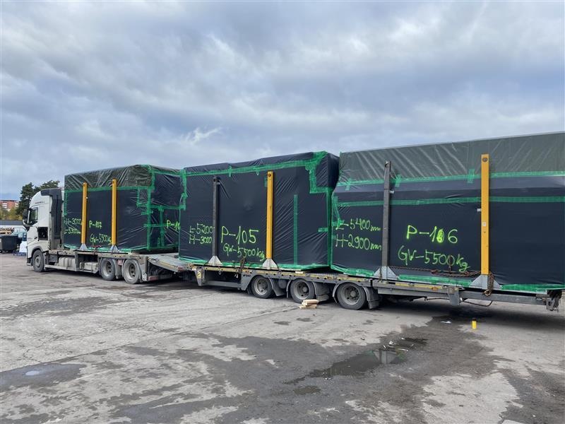 - Elemendi pakkide väljavedu (15t tõstuk) ja laadimine autodele (low-bed treilerid).