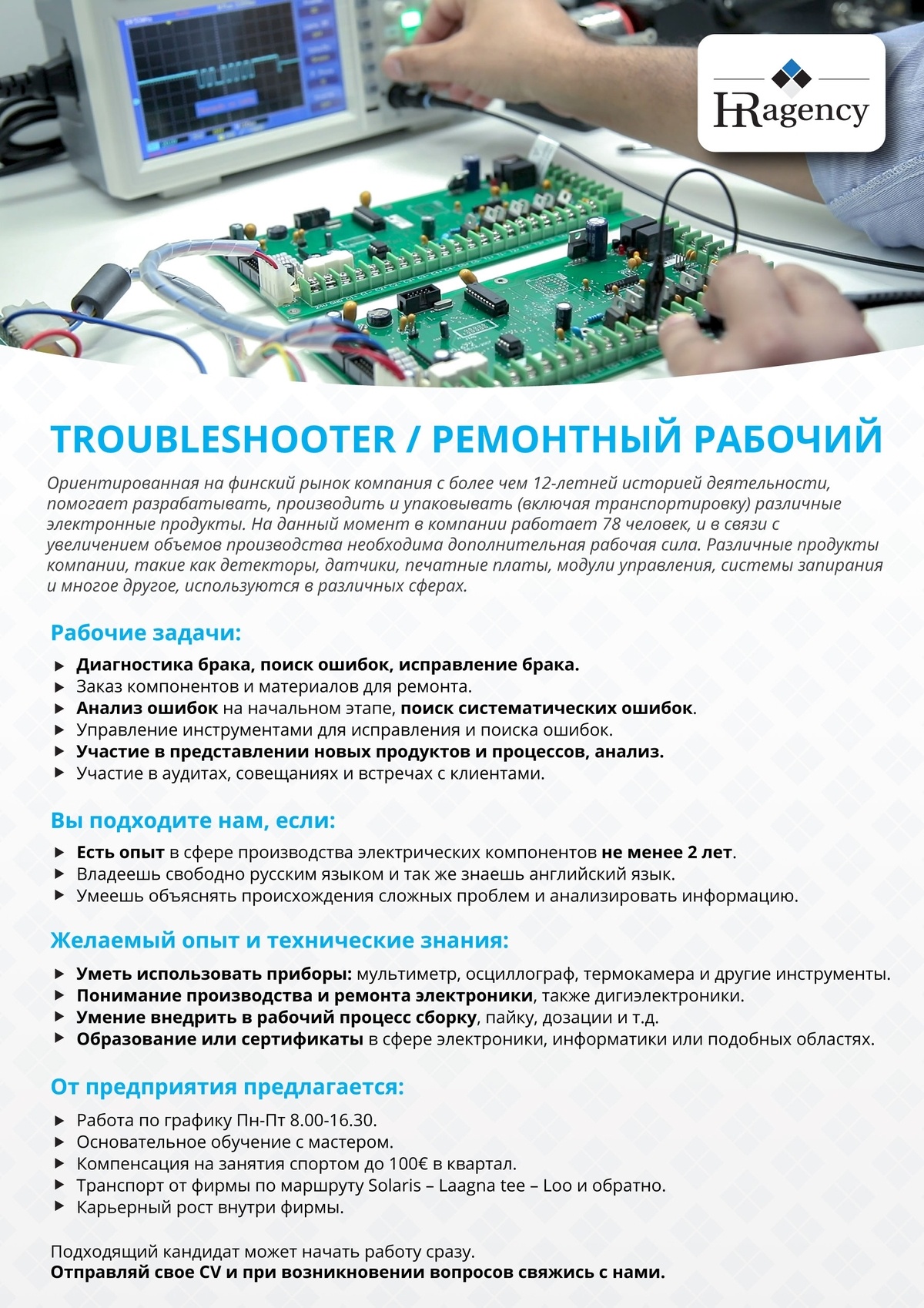 Ориентированная на финский рынок компания с более чем 12-летней историей деятельности, помогает разрабатывать, производить и упаковывать (включая транспортировку) различные электронные продукты. На данный момент в компании работает 78 человек, и в связи с увеличением объемов производства необходима постоянная дополнительная рабочая сила. Различные продукты компании, такие как детекторы, датчики, печатные платы, модули управления, системы запирания и многое другое, используются в различных сферах.
