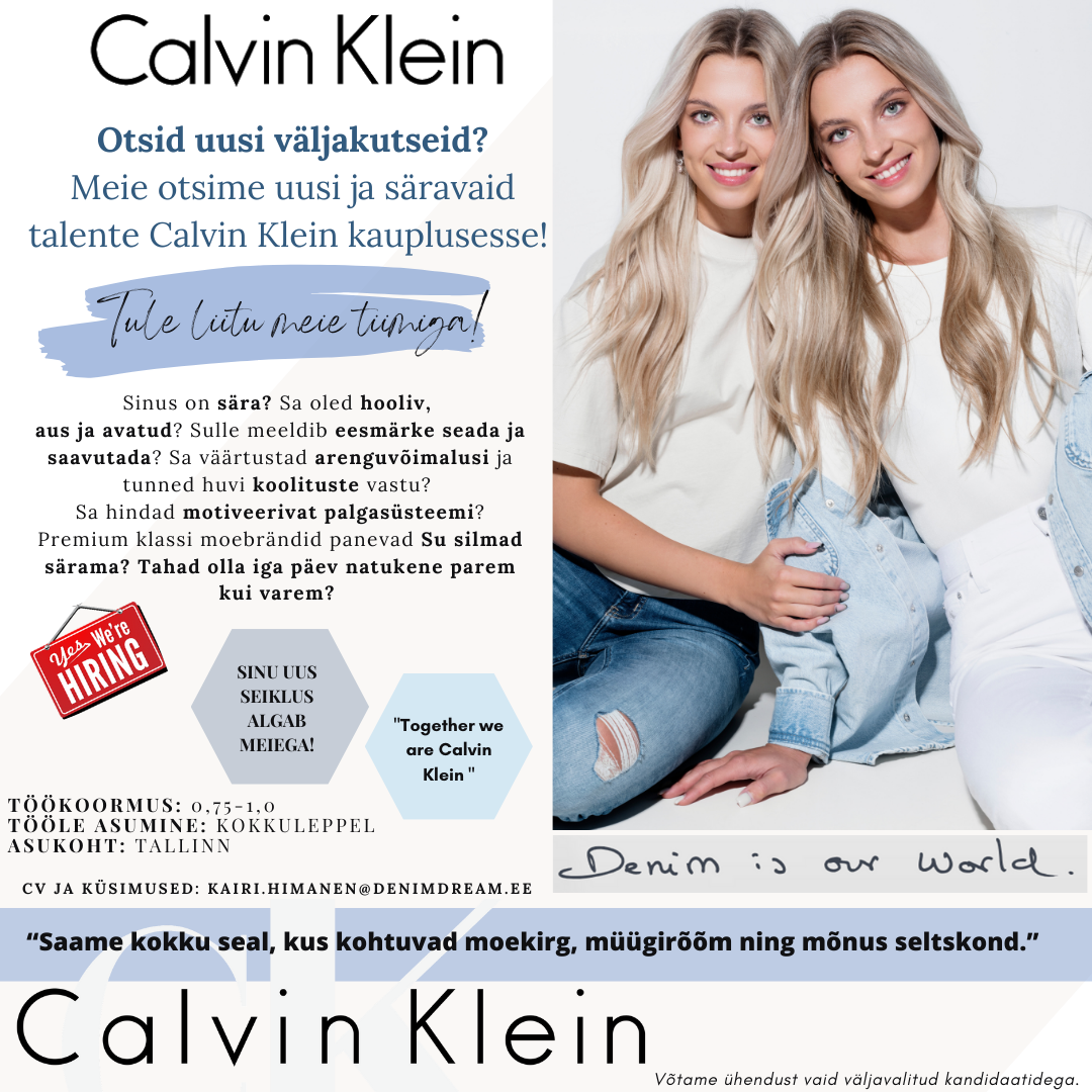Calvin Klein Lifestyle kauplus otsib oma tiimi eesmärgistatud, säravat ja hoolivat tiimiliiget! Kui tunned, et soovid olla osa Calvin Kleini maailmast, siis ole julge ja kandideeri!