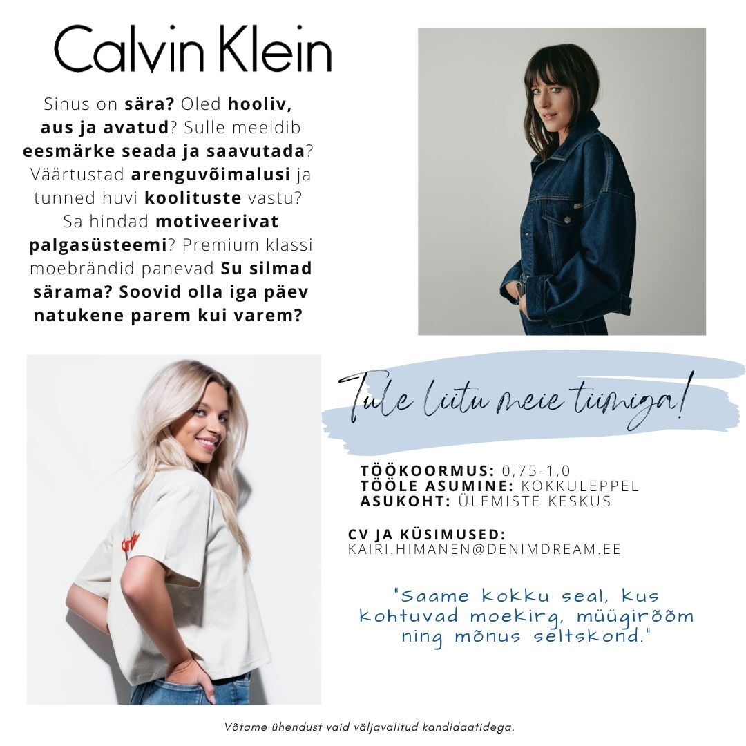 Calvin Klein Lifestyle kauplus otsib oma tiimi eesmärgistatud, säravat ja hoolivat tiimiliiget! Kui tunned, et soovid olla osa Calvin Kleini maailmast, siis ole julge ja kandideeri!