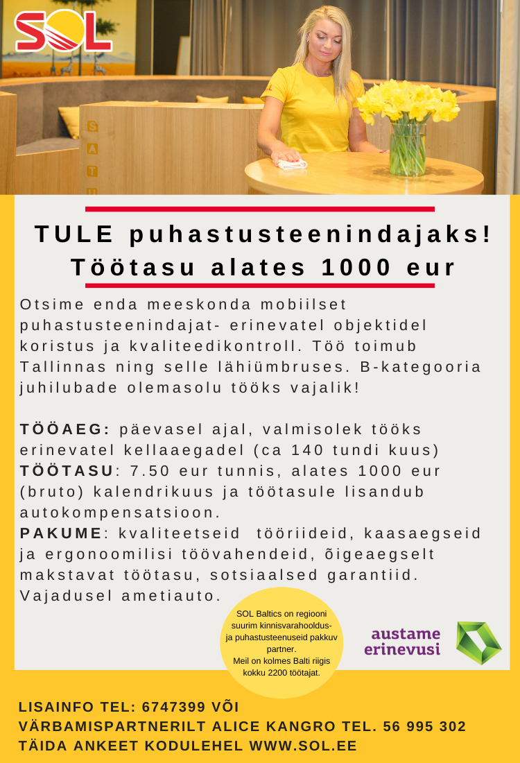 Töö toimub Tallinnas ning selle lähiümbruses. B-kategooria juhilubade olemasolu tööks vajalik!