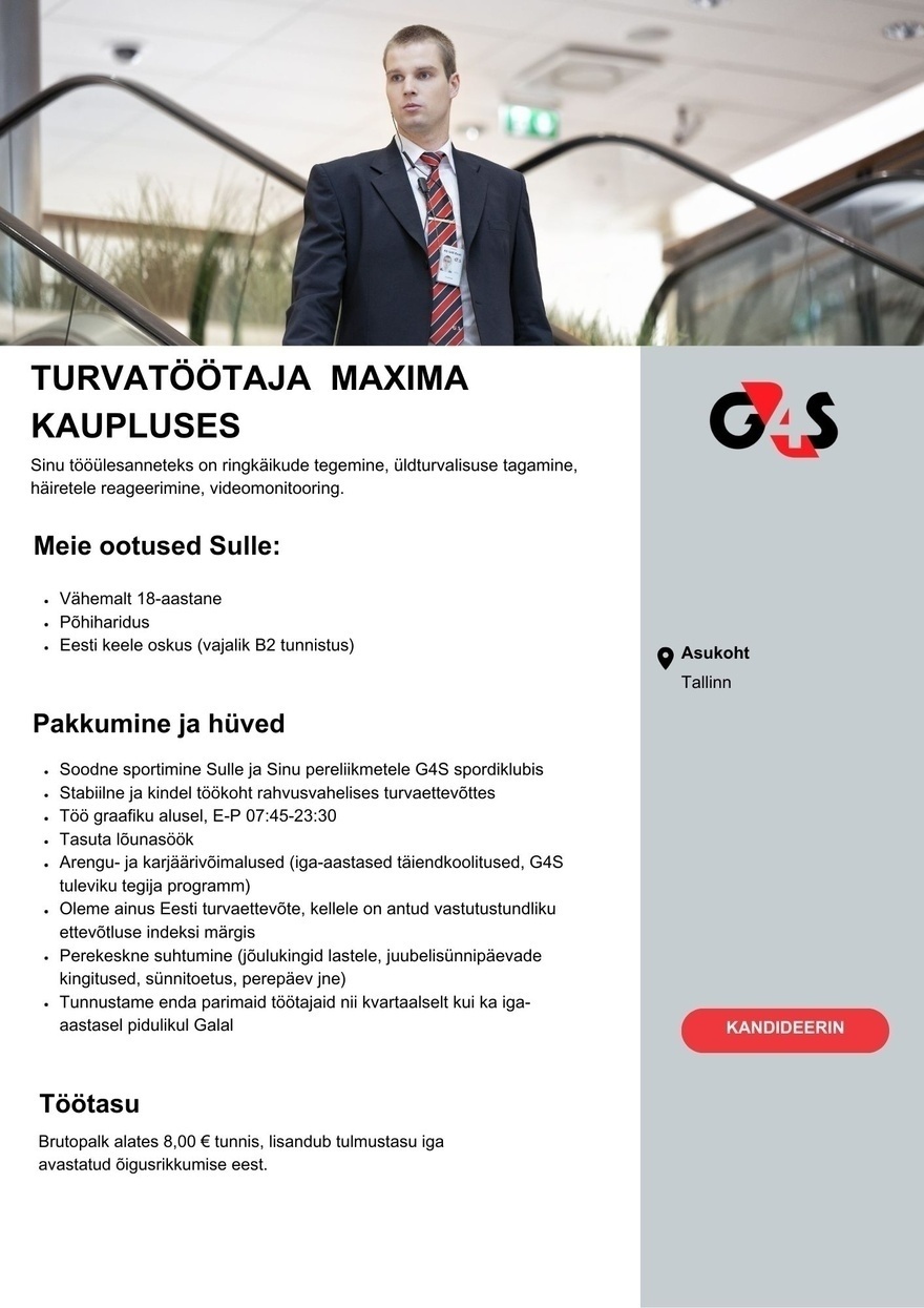 Sind ootavad mitmed võimalused enesetäiendamiseks. Pakume soodsaid sportimistingimusi meie G4S spordiklubis ning tasuta lõunasööki. Töö graafiku alusel, E-P 07:45-23:30. Töötasu alates 8,00 € tunnis, lisandub tulmustasu iga avastatud õigusrikkumise eest. Oleme Sulle kindla ja pikaajalise kogemusega tööandjaks.